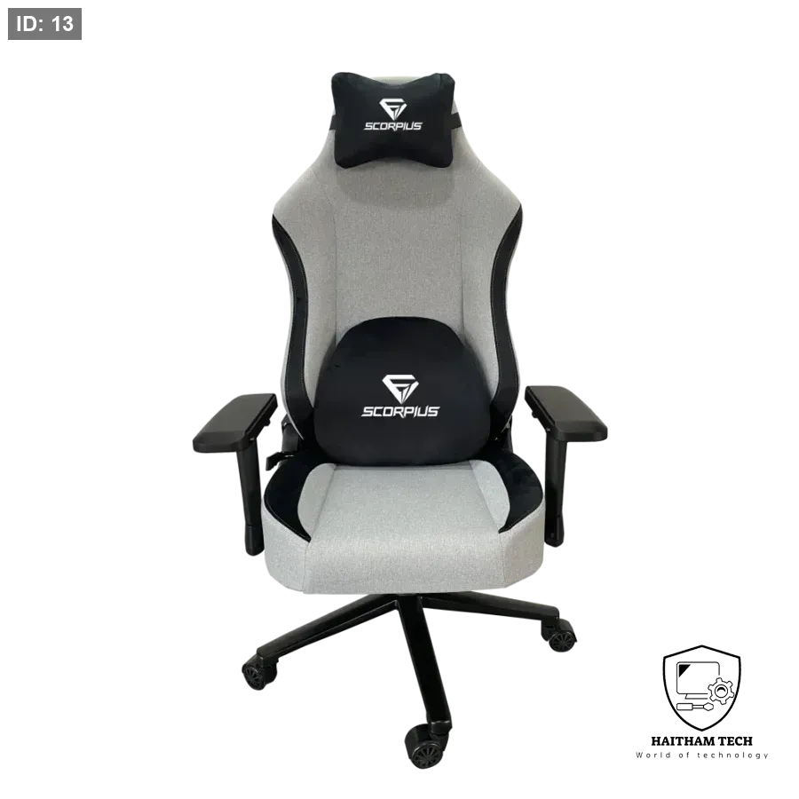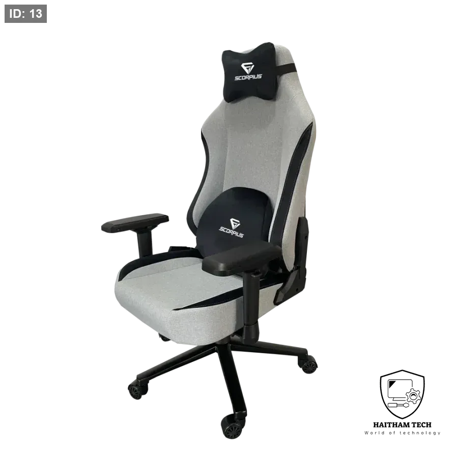 مقعد الألعاب SCORPIUS PERFORMANCE احترافي، مصنوع من قماش مريح بلون رمادي فاتح، مع خياطة عالية الجودة توفّر أقصى درجات الراحة.